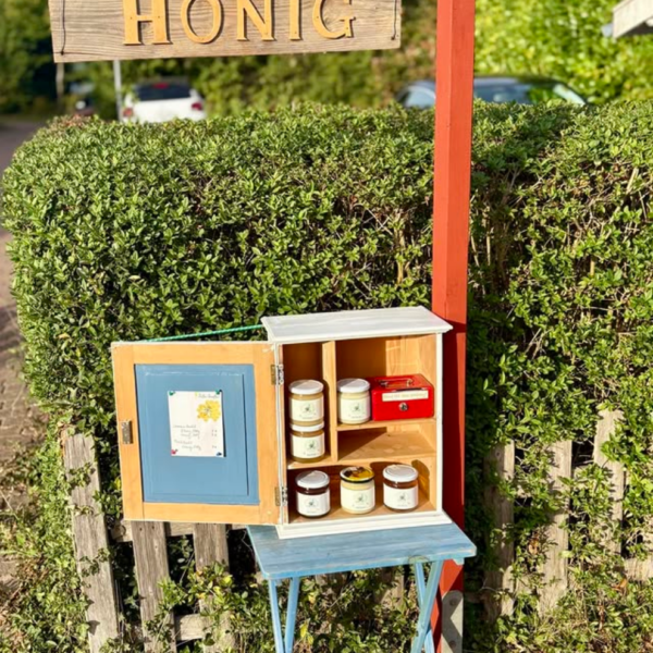 An seiner Adresse in Langenstücken steht ein liebevoll gebauter Verkaufsstand, an dem der Honig auf Vertrauensbasis gekauft werden kann – regionaler geht es kaum.